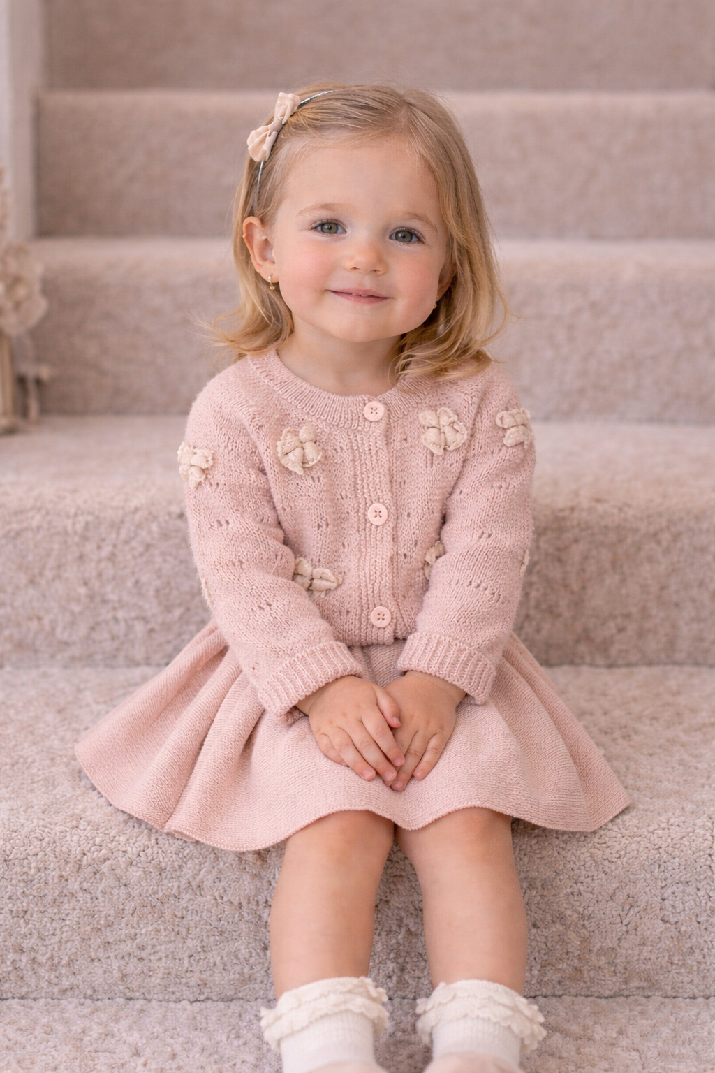 Featuring a long-sleeve knitted cardigan with delicate floral detailing and a matching skirt, this two-piece set offers a romantic, boutique-inspired silhouette. Perfect for everyday wear or special moments such as family gatherings, photoshoots, or celebrations, the Éloria Set brings understated sophistication to a thoughtfully curated baby wardrobe.